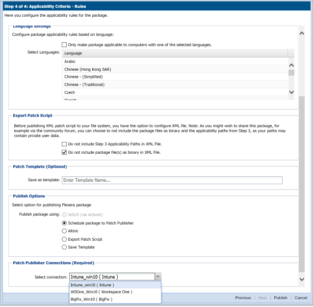 To publish a package through the Patch Publisher, select the Publish Options > Schedule package to Patch Publisher, and then select the required connection from the Patch Publisher Connections (Required) drop down.