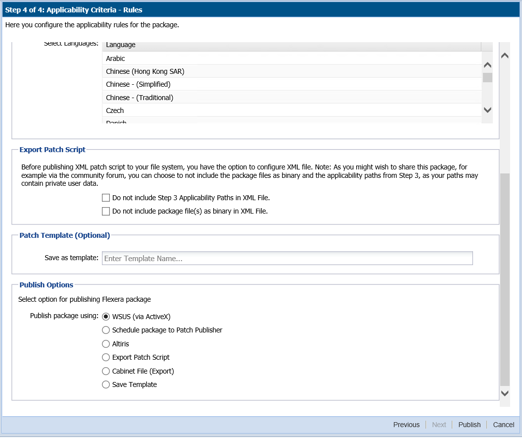 In Step 4 you should specify if you want to limit the package to 32-bit or 64-bit systems or computers with specific operating system languages. The patch file to be deployed will be automatically downloaded in the background by the Software Vulnerability Manager console. Once this is completed the Software Vulnerability Manager console will repackage and publish the update package into the WSUS/System Center. To export a package select File System (Export) and click Publish.
